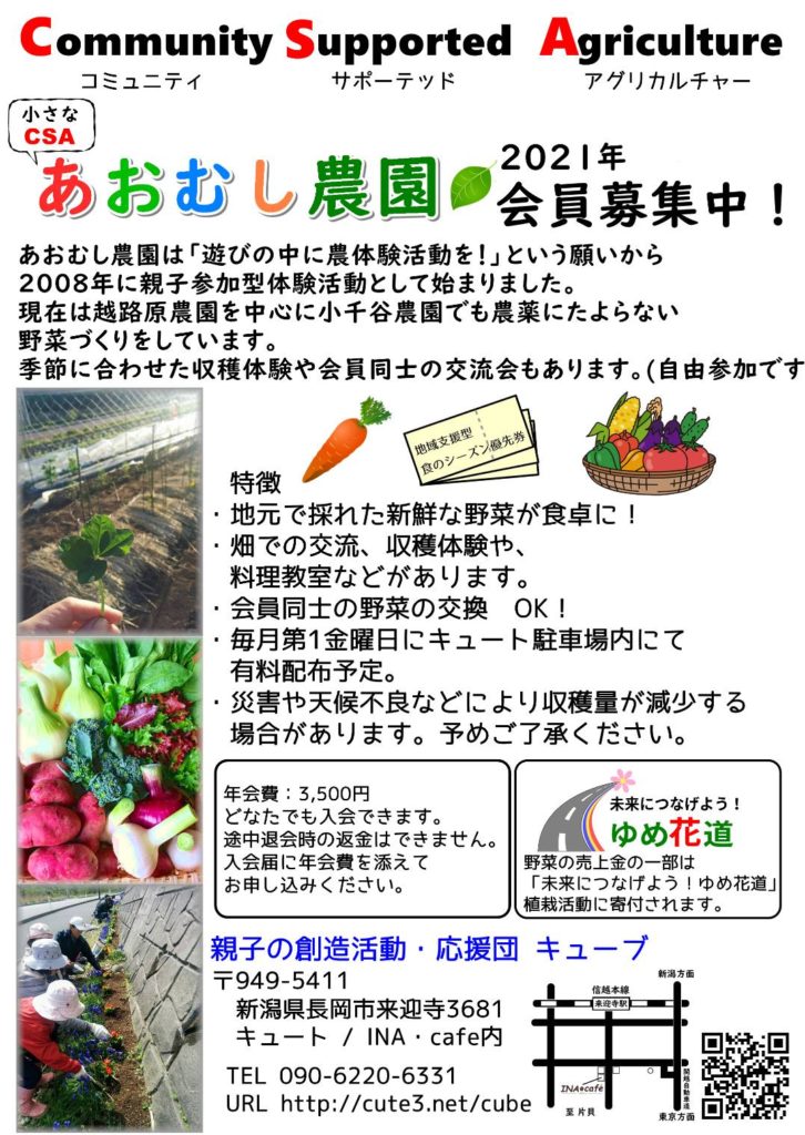 小さなCSAあおむし農園会員募集2021年 2021年2月25日 最終更新日時 : 2023年11月11日 cube-cute 申込み受付は先着順とさせていただきます。また、INA・cafe店での無農薬野菜の直売や、来迎寺郵便局等での販売も予定しておりますので、今年も宜しくお願い致します。 FacebookX